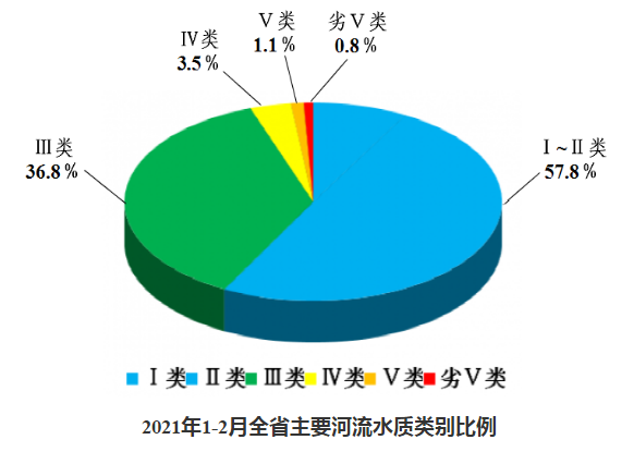 2021年1-2月,全省主要流域375個水質(zhì)評價斷面總體水質(zhì)為優(yōu)。Ⅰ~Ⅲ類水質(zhì)比例為94.6%,同比上升3.3個百分點;Ⅰ~Ⅱ類水質(zhì)比例為57.8%,同比下降1.3個百分點。各類水質(zhì)比例如下:Ⅰ類占8.1%,Ⅱ類占49.7%,Ⅲ類占36.8%,Ⅳ類占3.5%,Ⅴ類占1.1%,劣Ⅴ類占0.8%。